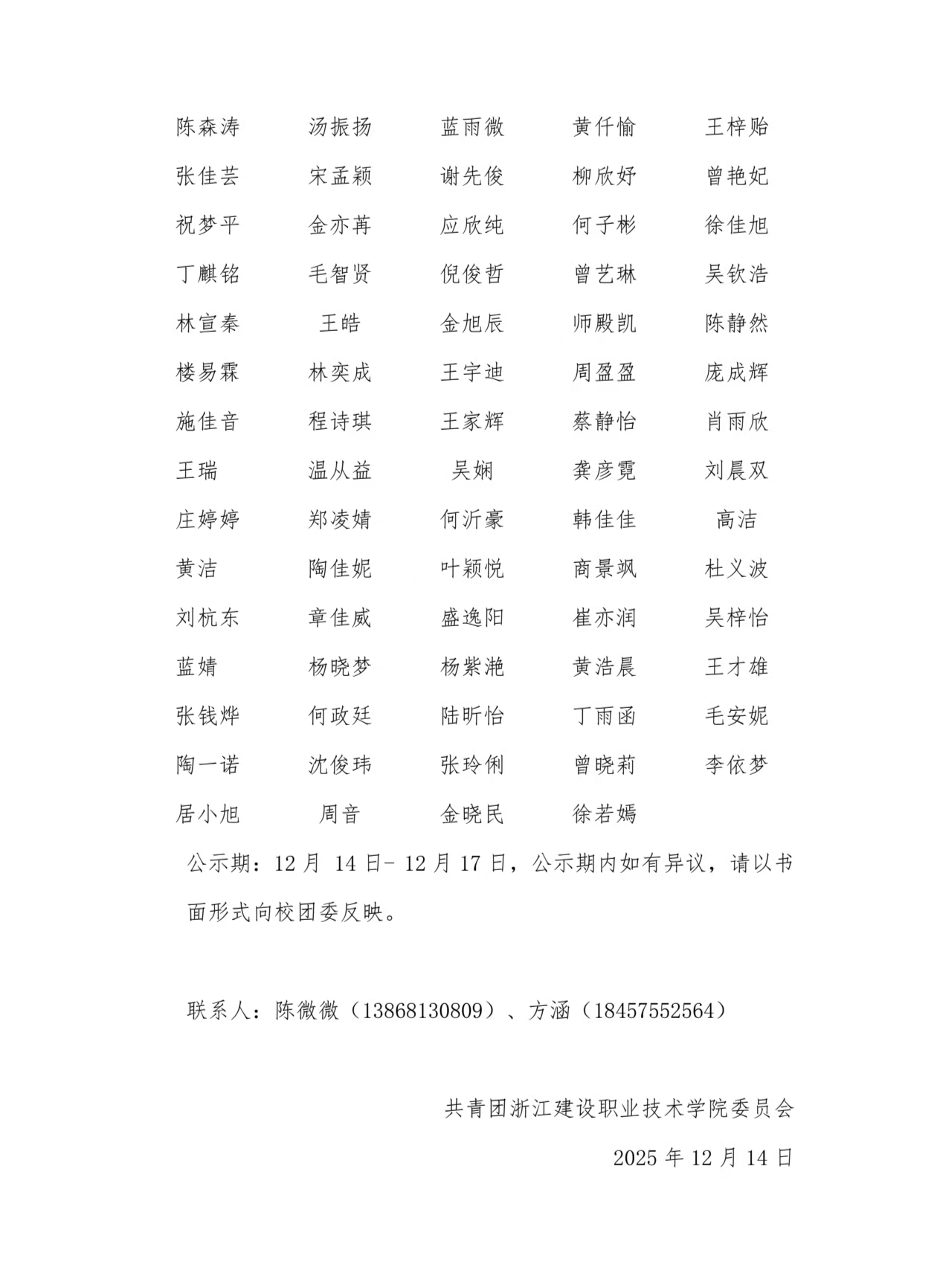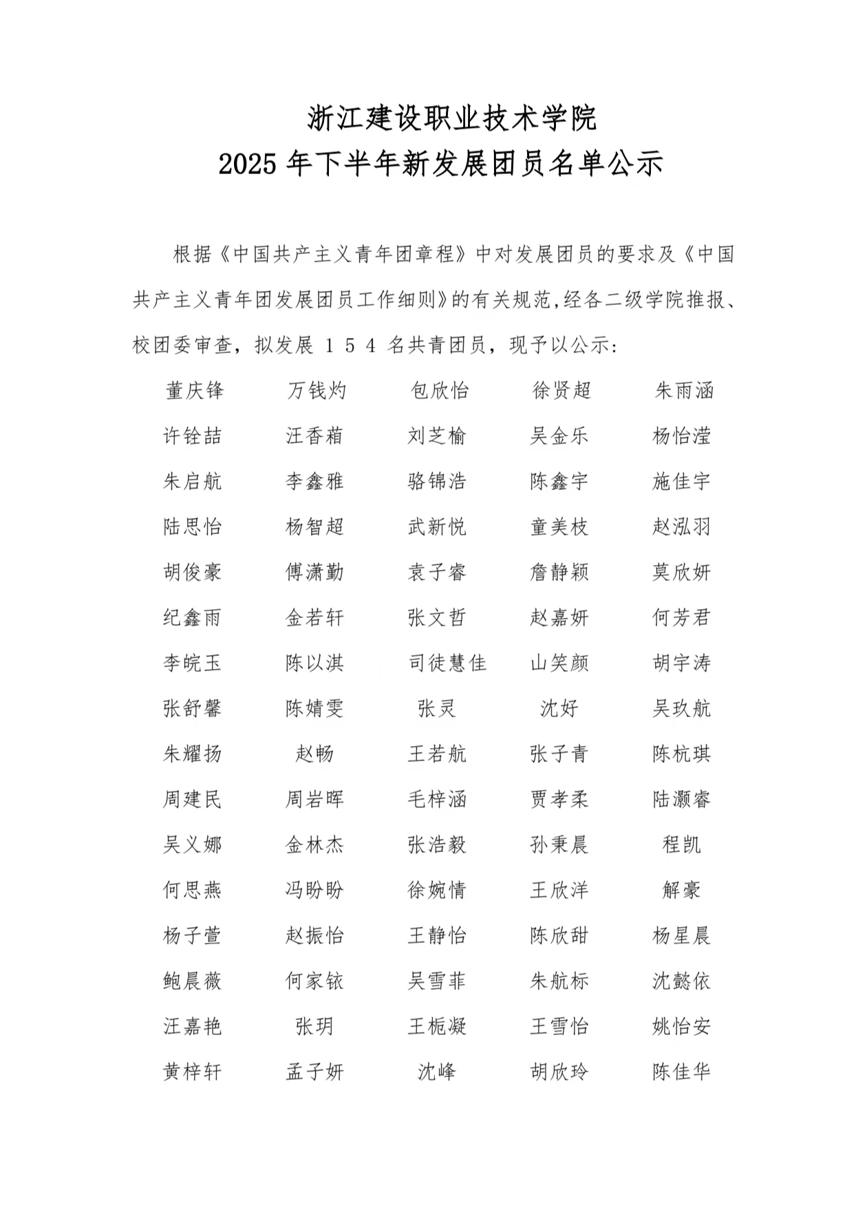 浙江建设职业技术学院2025年下半年新发展团员名单公示